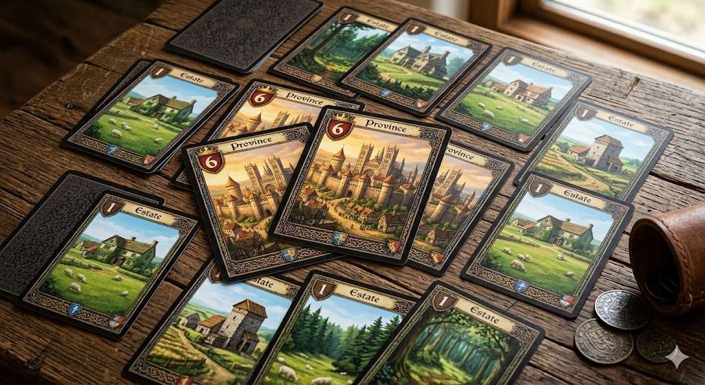 Pelin voittaa se, jolla on eniten pisteitä pakassaan, kun peli loppuu. Peli päättyy joko silloin, kun maakuntapino tyhjenee, tai kun mitkä tahansa kolme muuta korttipinoa tyhjenevät. Dominion lautapeli sisältää kolme peruspistekorttia: tilus (1 piste), herttuakunta (3 pistettä) ja maakunta (6 pistettä). On kriittistä ajoittaa pistekorttien ostaminen oikein. Jos ostat maakunnan liian aikaisin, se hidastaa pakkaasi liikaa. Jos odotat liian kauan, vastustaja saattaa viedä viimeiset maakunnat ja lopettaa pelin edukseen. .Read more in Wikipedia.